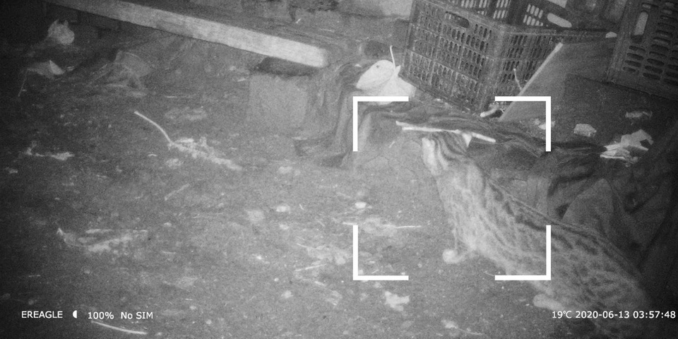 2020年4月,我院生物多樣性動物調查團隊在對花果山進行走訪調查之際,從景區管理處了解到花果山高老莊養雞場周邊深山內長期存在豹貓活動的情況。經咨詢后得知,自2016年高老莊生態養雞場成立以來,不斷發生散養雞被中大型捕食動物叼走情況,但并不清楚是什么動物所為,直至2019年秋季花果山發生一起車輛與不明貓科動物相撞后,經咨詢野保部門才知道原來是豹貓。據了解,豹貓在花果山上長期存在,但監測資料十分匱乏。團隊在了解情況后,對養雞場和周邊環境進行了細致的研究,在雞舍入口及豹貓可能經過的區域分別布設了2臺紅外相機。2020年6月13日約凌晨4點,正對雞舍的一臺紅外相機拍攝到了本次的主角——豹貓溜進雞舍的畫面。據養雞場楊老板反映,這只是周邊活動的數個豹貓家族中的其中一只,整個種群估計在6-10只。