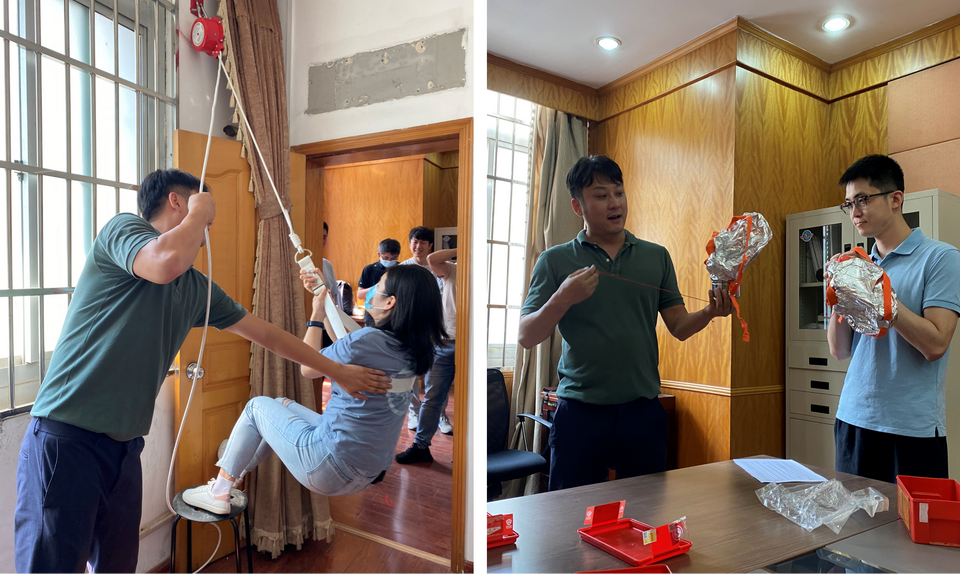 在消防戰(zhàn)士的指導下,員工們有序參與滅火器實操訓練,每個人都親手使用一次滅火器。此外,緩降器和防護面罩使用培訓及實操均在專業(yè)老師的指導下完成。