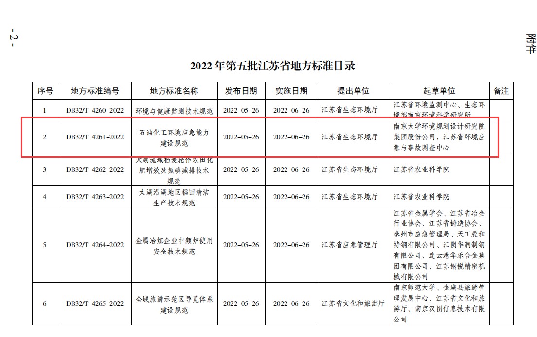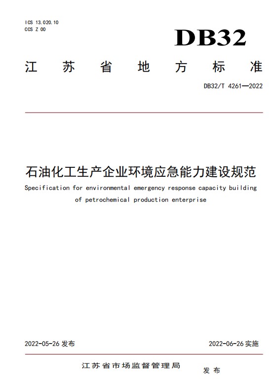 2022年5月26日,江蘇省市場(chǎng)監(jiān)督管理局發(fā)布江蘇省地方標(biāo)準(zhǔn)公告,正式批準(zhǔn)由南大環(huán)規(guī)院起草的環(huán)境安全領(lǐng)域標(biāo)準(zhǔn)——《石油化工生產(chǎn)企業(yè)環(huán)境應(yīng)急能力建設(shè)規(guī)范》(DB32/T 4261-2022),并將于2022年6月26日正式頒布實(shí)施。