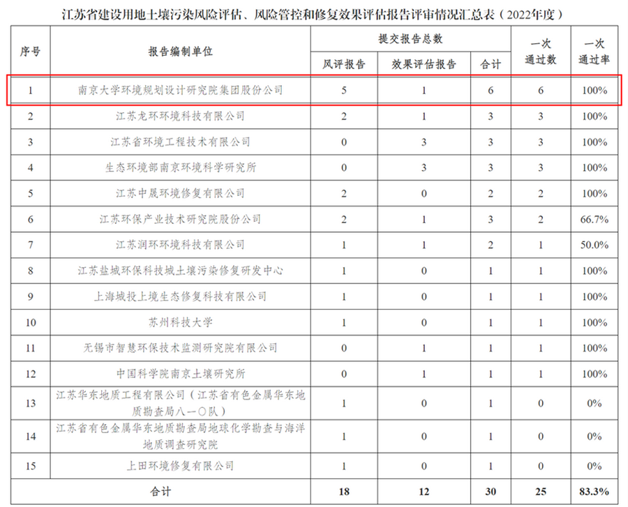 2023年4月24日,江蘇省生態環境廳公布了2022年度江蘇省建設用地土壤污染風險評估、風險管控和修復效果評估報告評審情況,我院所有報告均一次通過評審,通過率100%,位居全省前列。