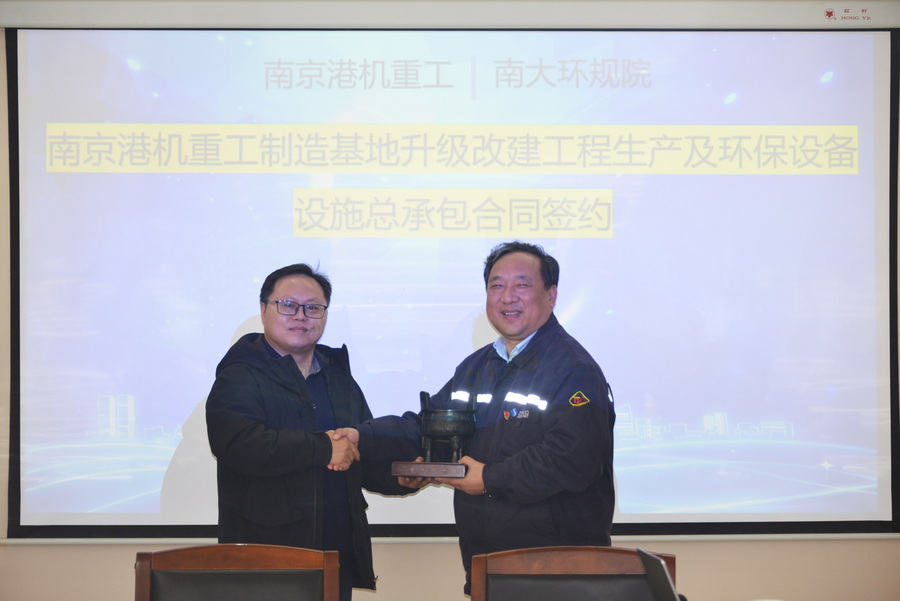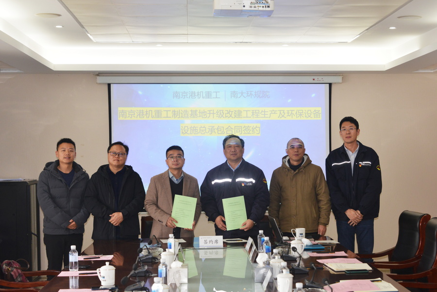 近期,南京港機重工制造有限公司與南大環規院舉行了“南京港機重工制造基地升級改建工程-生產及環保設備設施購置項目”總承包合同簽約啟動儀式,這標志著南大環規院工程技術中心研發的港機行業廢氣處理成套技術裝備正式落地。南京港機重工董事長張群、副總經理曾慶順、副總經理潘超,南大環規院常務副總裁吳俊鋒、黨委副書記李良、工程技術中心主任徐遵主等領導出席了儀式。